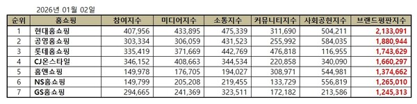 2026년 1월 TV홈쇼핑 브랜드평판 순위는 현대홈쇼핑, 공영홈쇼핑, 롯데홈쇼핑, CJ온스타일, 홈앤쇼핑, NS홈쇼핑, GS홈쇼핑 순이었다.