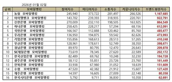 2026년 1월 모바일뱅킹 브랜드평판 순위는 농협, 아이엠뱅크, 신한은행, 하나은행, 국민은행, 우리은행, 기업은행, 부산은행, 경남은행, SC제일은행, 한국산업은행, 광주은행, 전북은행, 수협, 제주은행, 한국시티은행 모바일뱅킹 순이었다.
