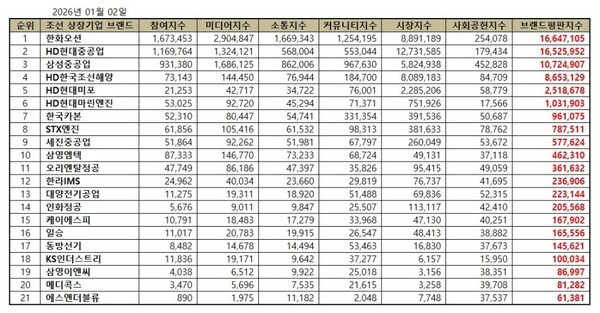 한국기업평판연구소는 조선 상장기업 21개 브랜드에 대해 2025년 12월 2일부터 2026년 1월 2일까지의 조선 상장기업 브랜드 빅데이터 60,726,216개를 분석한 결과 지난 12월 조선 상장기업 브랜드 빅데이터 66,004,374개와 비교하면 8.00% 줄어들었다고 밝혔다.