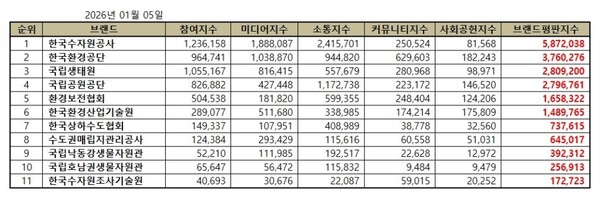 한국수자원공사, 기후에너지환경부 공공기관 2026년 1월 브랜드평판 1위 기록