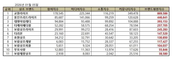 2026년 1월 상조 브랜드평판 순위는 교원라이프, 웅진프리드라이프, 대명아임레디, 더케이예다함, 보람상조라이프, 더리본, 효원상조, 보람상조개발, 보람상조피플, 부모사랑, 보람재향상조 순으로 나타났다.