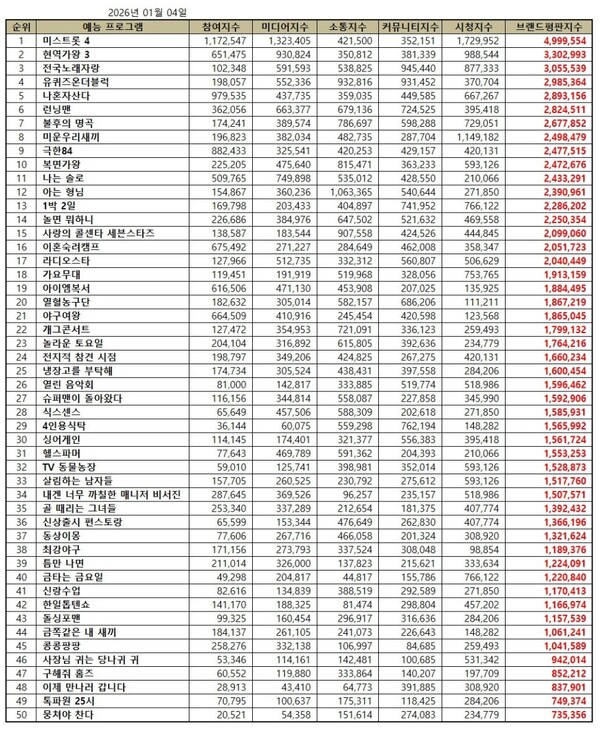한국기업평판연구소는 2025년 12월 4일부터 2026년 1월 4일까지 국민들에게 사랑받는 예능 프로그램 50개의 브랜드 빅데이터 91,533,278개를 분석하여 소비자들의 브랜드 참여와 소통량, 미디어소비, 브랜드 확산량, 소비량을 측정한 결과 지난 12월 예능 프로그램 브랜드 빅데이터 96,994,727개와 비교하면 5.63% 줄어들었다고 밝혔다.