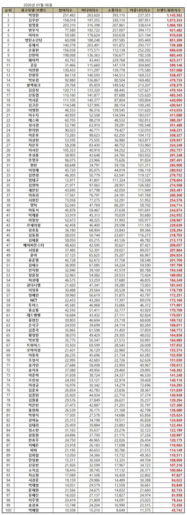 2026년 1월 광고모델 브랜드평판 30위 순위는 박정민, 김우빈, 임영웅, 변우석, 아이브, 방탄소년단, 유재석, 손흥민, 신민아, 페이커, 공유, 이찬원, 전현무, 박보검, 블랙핑크, 김유정, 신동엽, 박서준, 김고은, 이병헌, 이수지, 에스파, 성시경, 한지민, 이준호, 이상민, 차은우, 이서진, 추성훈, 추영우 순으로 분석됐다.