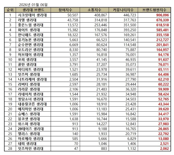 한국기업평판연구소는 국내 소비자에게 사랑받는 생리대 브랜드 28개에 대해 2025년 12월 6일부터 2026년 1월 6일까지의 생리대 브랜드 빅데이터 4,652,704개를 분석한 결과 지난 12월 생리대 브랜드 빅데이터 5,191,005개와 비교하면 10.37% 줄어들었다고 밝혔다.