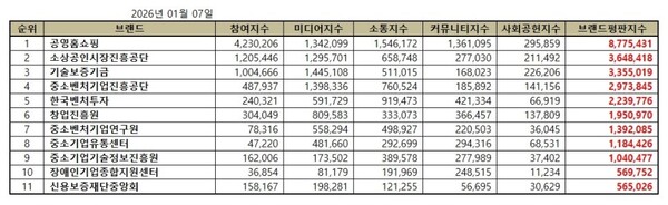 한국기업평판연구소는 중소벤처기업부 공공기관 11개 브랜드에 대해 2025년 12월 7일부터 2026년 1월 7일까지의 중소벤처기업부 공공기관 브랜드 빅데이터 27,695,225개를 분석한 결과 지난 12월 중소벤처기업부 공공기관 브랜드 빅데이터 30,640,968개와 비교하면 9.61% 줄어들었다고 밝혔다.