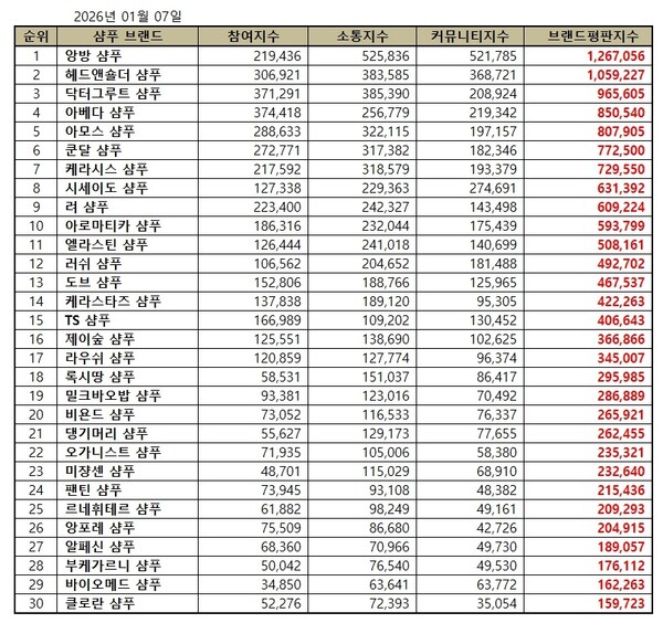 2026년 1월 샴푸 브랜드평판 순위는 앙방, 헤드앤숄더, 닥터그루트, 아베다, 아모스, 쿤달, 케라시스, 시세이도, 려, 아로마티카, 엘라스틴, 러쉬, 도브, 케라스타즈, TS, 제이숲, 라우쉬, 록시땅, 밀크바오밥, 비욘드, 댕기머리, 오가니스트, 미쟝센, 팬틴, 르네휘테르, 앙포레, 알페신, 부케가르니, 바이오메드, 클로란 샴푸 순으로 분석됐다.