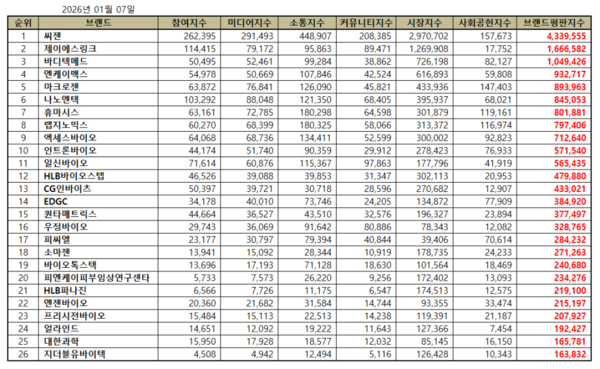 한국기업평판연구소는 생명과학서비스 상장기업 26개 브랜드에 대해 2025년 12월 7일부터 2026년 1월 7일까지의 생명과학서비스 상장기업 브랜드 빅데이터 17,374,996개를 분석한 결과 지난 12월 생명과학서비스 상장기업 브랜드 빅데이터 18,589,447개와 비교하면 6.53% 줄어들었다고 밝혔다.
