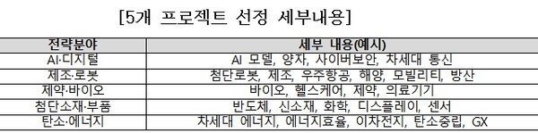 중기부는 국가경쟁력과 직결된 △AI·디지털 △첨단로봇·제조 △제약·바이오 △첨단소재·부품 △탄소·에너지의 5개 전략분야를 중심으로 단계별 검증을 거쳐 국내 산업생태계 혁신과 글로벌 신시장 창출이 가능한 5개 프로젝트를 선정할 계획이다.