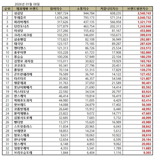 한국기업평판연구소는 대한민국 소비자들에게 사랑받는 제과제빵 전문점 브랜드 33개에 대해 2025년 12월 8일부터 2026년 1월 8일까지의 제과제빵 전문점 브랜드 빅데이터 12,707,259개를 분석한 결과 지난 12월에 분석된 제과제빵 전문점 브랜드 빅데이터 13,131,308개와 비교하면 3.23% 줄어들었다고 밝혔다.