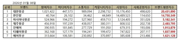 한국기업평판연구소는 항공사 상장기업 7개 브랜드에 대해 2025년 12월 8일부터 2026년 1월 8일까지의 항공사 상장기업 브랜드 빅데이터 48,221,381개를 분석한 결과 지난 12월 항공사 상장기업 브랜드 빅데이터 44,696,523개와 비교하면 7.89% 증가했다고 밝혔다.