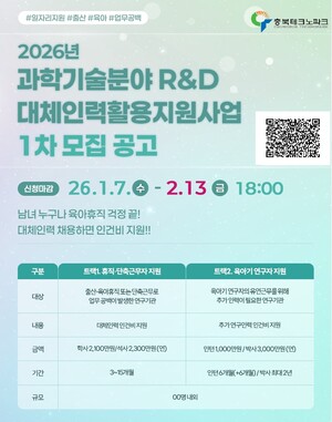[에너지신문] (재)충북테크노파크(이하 충북TP)는 한국여성과학기술인육성재단(이하 WISET)과 협약을 통해‘2026년 과학기술분야 R&D 대체인력 활용 지원사업’1차 모집을 이달 7일부터 2월 13일까지 진행한다고 밝혔다.
