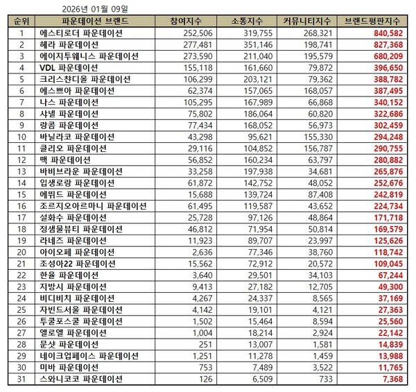 파운데이션 2026년 1월 브랜드평판...에스티로더, 헤라, 에이지투웨니스 順