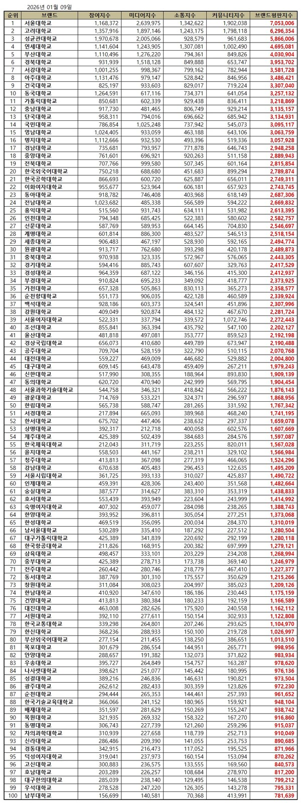 대학교 2026년 1월 브랜드평판...서울대학교, 고려대학교, 성균관대학교 順