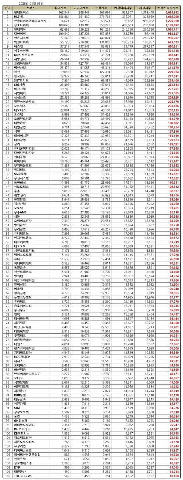 한국기업평판연구소는 국내 자동차부품 상장기업 110개 브랜드에 대해 2025년 12월 9일부터 2026년 1월 9일까지의 110개 자동차부품 상장기업의 브랜드 빅데이터 25,681,104개를 분석한 결과 지난 12월 자동차부품 상장기업 브랜드 빅데이터 27,128,904개와 비교하면 5.34% 줄어들었다고 밝혔다.