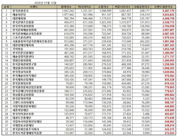 문화체육관광부 공공기관 2026년 1월 브랜드평판...한국관광공사, 예술의전당, 대한체육회 順