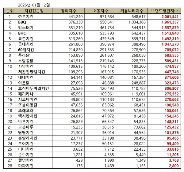 한국기업평판연구소는 대한민국 소비자들이 사랑하는 28개 치킨 전문점 브랜드에 대해 2025년 12월 12일부터 2026년 1월 12일까지의 치킨 전문점 브랜드 빅데이터 15,288,907개를 분석한 결과 지난 12월 치킨 전문점 브랜드 빅데이터 15,748,297개와 비교해보면 2.92% 줄어들었다고 밝혔다.