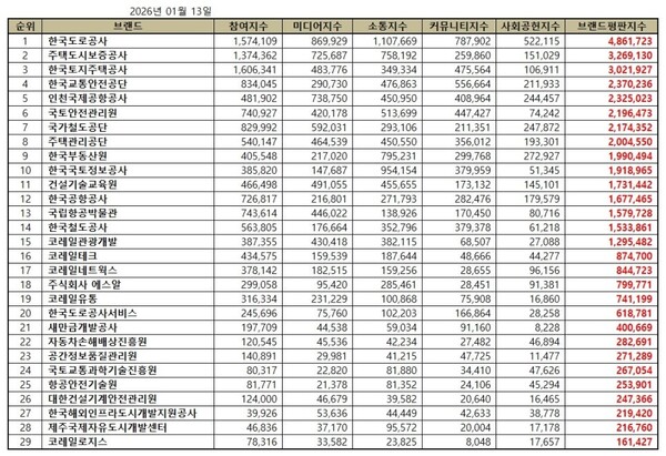 2026년 1월 국토교통부 공공기관 브랜드평판 순위는 한국도로공사, 주택도시보증공사, 한국토지주택공사, 한국교통안전공단, 인천국제공항공사, 국토안전관리원, 국가철도공단, 주택관리공단, 한국부동산원, 한국국토정보공사, 건설기술교육원, 한국공항공사, 국립항공박물관, 한국철도공사, 코레일관광개발, 코레일테크, 코레일네트웍스, 주식회사 에스알, 코레일유통, 한국도로공사서비스, 새만금개발공사, 자동차손해배상진흥원, 공간정보품질관리원, 국토교통과학기술진흥원, 항공안전기술원, 대한건설기계안전관리원, 한국해외인프라도시개발지원공사, 제주국제자유도시개발센터, 코레일로지스 순이었다.