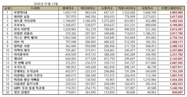 한국기업평판연구소는 2025년 12월 13일부터 2026년 1월 13까지 국민들에게 사랑받는 드라마 20개의 브랜드 빅데이터 54,747,519개를 분석하여 소비자들의 브랜드 참여와 소통량, 미디어소비, 브랜드 확산량, 소비량을 측정한 결과 지난 12월 드라마 브랜드 빅데이터 60,055,822개와 비교하면 8.84% 줄어들었다고 밝혔다.