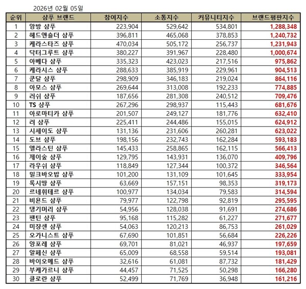 2026년 2월 샴푸 브랜드평판 순위는 앙방, 헤드앤숄더, 케라스타즈, 닥터그루트, 아베다, 케라시스, 쿤달, 아모스, 러쉬, TS, 아로마티카, 려, 시세이도, 도브, 엘라스틴, 제이숲, 라우쉬, 밀크바오밥, 록시땅, 르네휘테르, 비욘드, 댕기머리, 팬틴, 미쟝센, 오가니스트, 앙포레, 알페신, 바이오메드, 부케가르니, 클로란 샴푸 순으로 분석됐다.