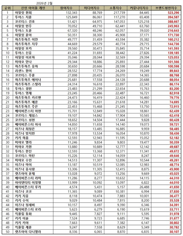 2026년 2월 신인 아이돌 개인 브랜드평판 30위 순위는 아일릿 원희, 투어스 지훈, 코르티스 건호, 아일릿 민주, 투어스 도훈, 아일릿 윤아, 하츠투하츠 이안, 하츠투하츠 지우, 아일릿 모카, 투어스 신유, 아일릿 이로하, 미야오 안나, 하츠투하츠 유하, 리센느 원이, 코르티스 주훈, 하츠투하츠 에이나, 하츠투하츠 스텔라, 투어스 경민, 투어스 영재, 하츠투하츠 카르멘, 하츠투하츠 예온, 하츠투하츠 주은, 베이비몬스터 아현, 코르티스 제임스, 코르티스 성현, 베이비몬스터 아사, 이즈나 최정은, 이즈나 방지민, 키키 하음, 미야오 엘라 순으로 분석됐다.