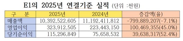 E1, 매출 줄고 영업‧당기순익 늘어…주당 4100원 배당