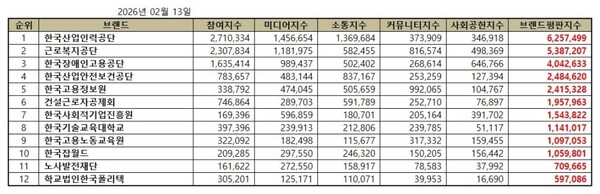 한국기업평판연구소는 고용노동부 공공기관 12개 브랜드에 대해 2026년 1월 13일부터 2026년 2월 13일까지의 고용노동부 공공기관 브랜드 빅데이터 28,693,695개를 분석한 결과 지난 1월 고용노동부 공공기관 브랜드 빅데이터 31,828,109개와 비교하면 9.85% 줄어들었다고 밝혔다.