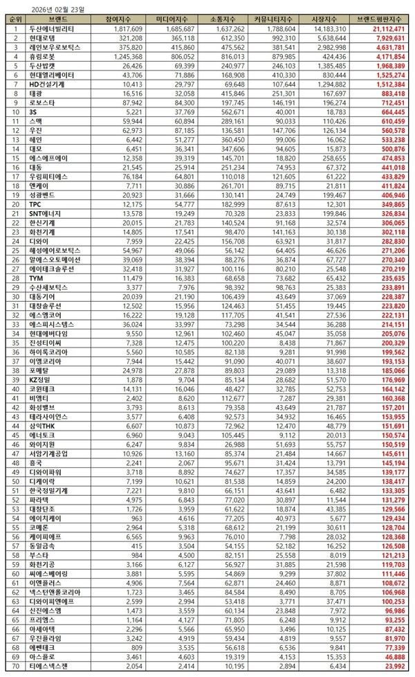한국기업평판연구소는 기계 상장기업 70개 브랜드에 대해 2026년 1월 23일부터 2026년 2월 23일까지의 기계 상장기업 브랜드 빅데이터 58,123,492개를 분석한 결과 지난 1월 기계 상장기업 브랜드 빅데이터 45,220,925개와 비교하면 28.53% 증가했다고 밝혔다.