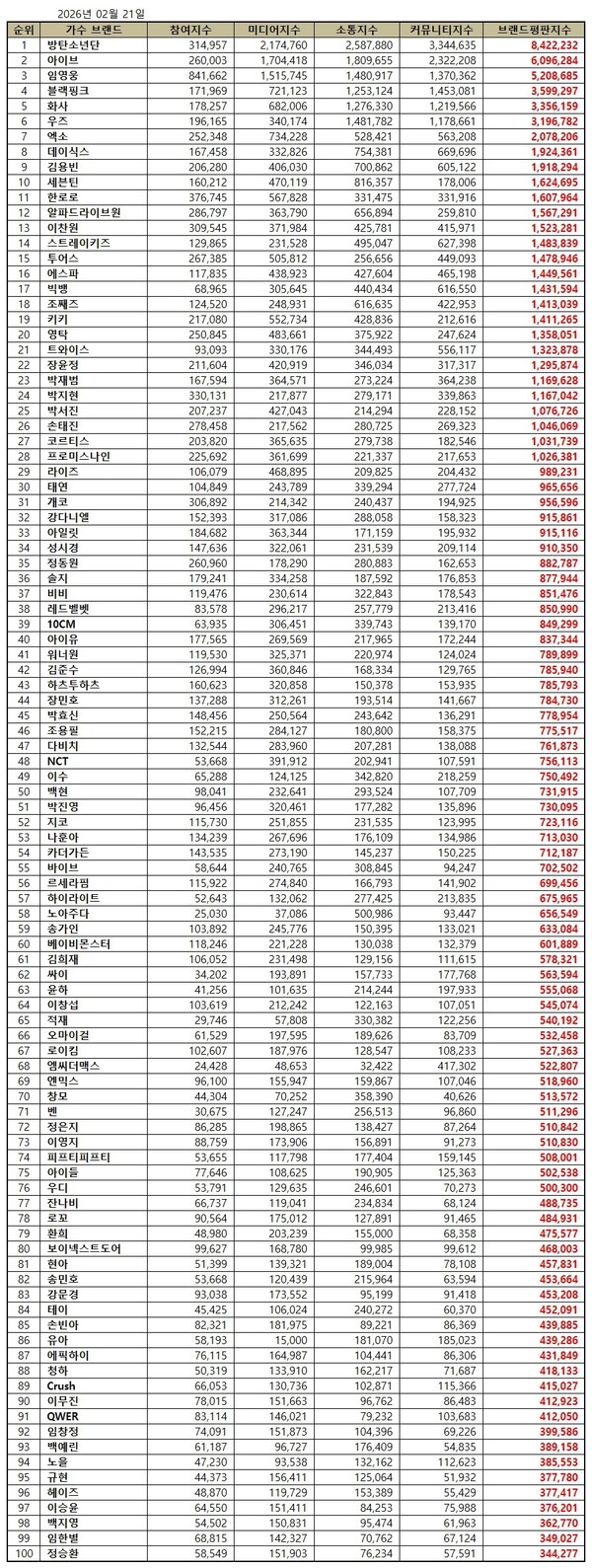 한국기업평판연구소는 2026년 1월 21일부터 2026년 2월 21일까지의 가수 브랜드 빅데이터 105,145,096개를 분석한 결과 지난 1월 가수 브랜드 빅데이터 116,391,810개와 비교하면 9.66% 줄어들었다고 밝혔다.