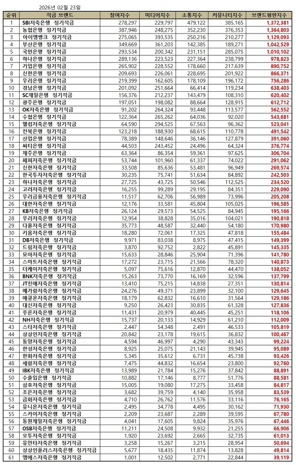 2026년 2월 정기적금 브랜드평판 30위 순위는 SBI저축은행, 농협은행, 아이엠뱅크, 부산은행, 국민은행, 하나은행, 기업은행, 신한은행, 우리은행, 경남은행, SC제일은행, 광주은행, OK저축은행, 수협은행, 웰컴저축은행, 전북은행, 산업은행, 씨티은행, 제주은행, 페퍼저축은행, 신한저축은행, 한국투자저축은행, 하나저축은행, 고려저축은행, 우리금융저축은행, 대한저축은행, KB저축은행, 우리저축은행, 다올저축은행, 키움저축은행 정기적금 순으로 나타났다.