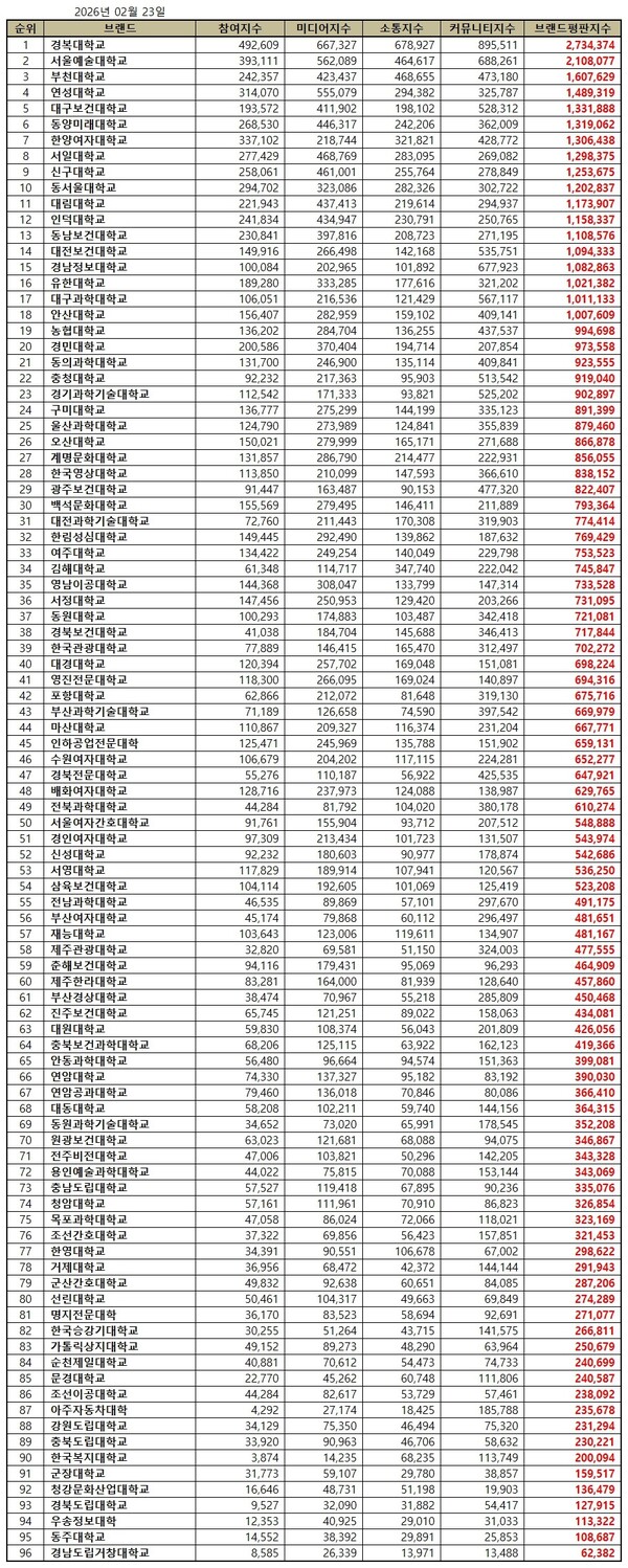한국기업평판연구소는 2026년 1월 23일부터 2026년 2월 23일까지의 전문대학 브랜드 빅데이터 63,982,429개를 분석한 결과 지난 1월 전문대학 브랜드 빅데이터 98,791,685개와 비교하면 35.24% 줄어들었다고 밝혔다.