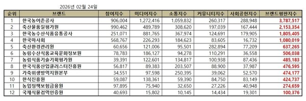 한국기업평판연구소는 농림축산식품부 공공기관 12개 브랜드에 대해 2026년 1월 24일부터 2026년 2월 24일까지의 농림축산식품부 공공기관 브랜드 빅데이터 12,205,325개를 분석한 결과 지난 1월 농림축산식품부 공공기관 브랜드 빅데이터 11,433,169개와 비교하면 6.75% 증가했다고 밝혔다.