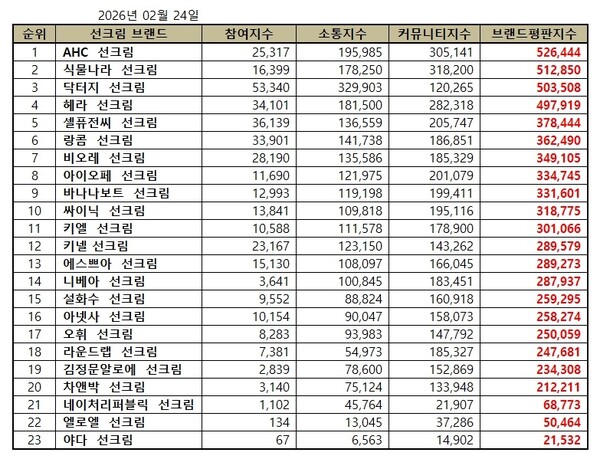 2026년 2월 선크림 브랜드평판 순위는 AHC, 식물나라, 닥터지, 헤라, 셀퓨전씨, 랑콤, 비오레, 아이오페, 바나나보트, 싸이닉, 키엘, 키넬, 에스쁘아, 니베아, 설화수, 아넷사, 오휘, 라운드랩, 김정문알로에, 차앤박, 네이처리퍼블릭, 엘로엘, 야다 선크림 순으로 분석됐다.