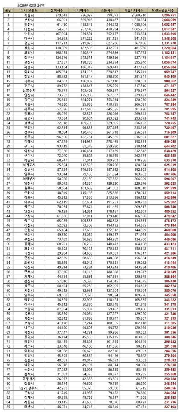 한국기업평판연구소는 2026년 1월 24일부터 2026년 2월 24일까지의 도시 브랜드 빅데이터 56,390,608개를 분석한 결과 지난 1월 도시 브랜드 빅데이터 57,505,201개와 비교하면 1.94% 줄어들었다고 밝혔다.