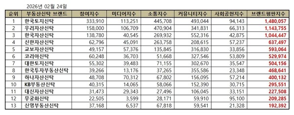 국내 부동산신탁 브랜드평판 2026년 2월 순위는 한국토지신탁, 우리자산신탁, 한국자산신탁, 신한자산신탁, 교보자산신탁, 코리아신탁, 대한토지신탁, 한국투자부동산신탁, 하나자산신탁, KB부동산신탁, 대신자산신탁, 무궁화신탁, 신영부동산신탁 순이었다.