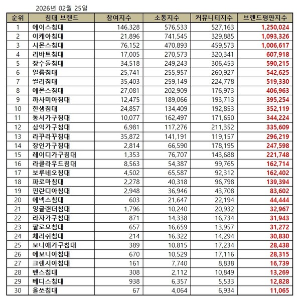 한국기업평판연구소는 국내 소비자에게 사랑받는 침대 브랜드 30개에 대해 2026년 1월 25일부터 2026년 2월 25일까지의 침대 브랜드 빅데이터 9,040,011개를 분석한 결과 지난 1월에 분석한 침대 브랜드 빅데이터 8,302,885개와 비교하면 8.88% 증가했다고 밝혔다.
