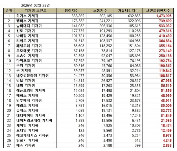 한국기업평판연구소는 국내 소비자에게 사랑받는 기저귀 브랜드 27개에 대해 2026년 1월 25일부터 2026년 2월 25일까지의 기저귀 브랜드 빅데이터 5,928,308개를 분석한 결과 지난 1월 기저귀 브랜드 빅데이터 6,605,139개와 비교하면 10.25% 줄어들었다고 밝혔다.