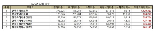 2026년 2월 특허청 공공기관 브랜드평판 순위는 한국특허정보원, 한국발명진흥회, 한국특허기술진흥원, 한국지식재산보호원, 한국특허전략개발원, 한국지식재산연구원 순이었다.