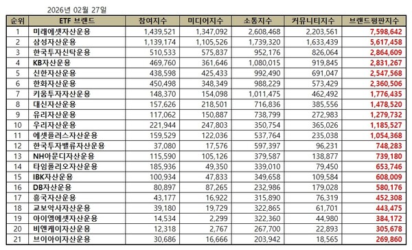 한국기업평판연구소는 ETF 발행기업 21개 브랜드에 대해 2026년 1월 27일부터 2026년 2월 27일까지의 ETF 발행기업 브랜드 빅데이터 35,779,520개를 분석한 결과 지난 1월 ETF 발행기업 브랜드 빅데이터 31,585,123개와 비교하면 13.28% 증가했다고 밝혔다.
