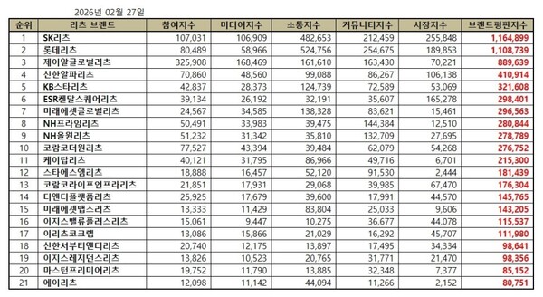 한국기업평판연구소는 21개 리츠 브랜드에 대해 2026년 1월 27일부터 2026년 2월 27일까지의 리츠 브랜드 빅데이터 6,779,578개를 분석한 결과 지난 1월 리츠 브랜드 빅데이터 6,459,389개와 비교하면 4.96% 증가했다고 밝혔다.
