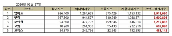 가상화폐거래소 2026년 2월 브랜드평판 순위는 업비트, 빗썸, 코인원, 코빗, 고팍스 순이었다.