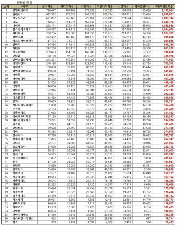 건강관리장비 상장기업 2026년 2월 브랜드평판...엘앤씨바이오, 클래시스, 지노믹트리 順