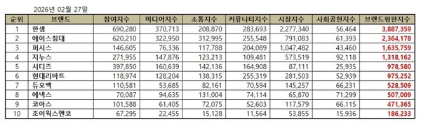 한국기업평판연구소는 국내 가구 상장기업에 대해 2026년 1월 27일부터 2026년 2월 27일까지의 가구 상장기업 브랜드 빅데이터 12,852,407개를 분석한 결과 지난 1월 가구 상장기업 브랜드 빅데이터 13,228,998개와 비교하면 2.85% 줄어들었다고 밝혔다.