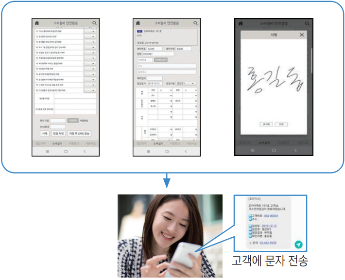 기존의 종이문서 '소비설비 안전점검표'는 이제 스마트폰을 통해 전자적으로 처리할 수 있습니다. 전자문서법에 따라 모든 문서는 디지털화되어 안전하게 저장되며, 고객의 서명도 스마트폰으로 간편하게 할 수 있습니다.